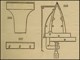 has been employed extensively in Paris, and has enabled its proprietors to realize a handsome fortune. The French complain that "it has inundated the world with gloves, male of excellent quality, at 30 per cent. under their former wholesale prices". The instrument is shown in profile ready for action in Fig. 525. It resembles an iron vice, having the upper portion of each jaw made of brass and tipped with a kind of comb of the same metal. The teeth of this comb, only one twelfth of an inch long, are perfectly regular and equal. Change combs are provided for different styles of work. The vice a a is made fast to the edge of the bench or table b, of the proper height, by a thumb-screw c, armed with a cramp which lays hold of the wood. Of the two jaws composing the machine, the one D is made fast to the foot A A, but the other e is moveable upon the solid base of the machine, by means of a hinge at the point F. At I I is shown how the upper brass portion is adjusted to the lower part made of iron; the two being secured to each other by two stout screws. The comb, seen separately in Fig. 527, is made fast to the upper end of each jaw, by the three screws nnn. Fig. 526 is a front view of the jaw mounted with its comb, to illustrate its construction. The lever k corresponds by the stout iron wire l, with a pedal pressed by the needlewoman's foot, whenever she wishes to separate the two jaws, in order to insert between them the parallel edges of leather to be sewed. The instant she lifts her foot, the two jaws join by the force of the spring g, which pushes the moveable jaw e against the stationary one D. The spring is made fast to the frame of the vice by the screw H. After putting the double edge to be sewed in its place, the woman passes her needle successively through all the teeth of the comb and is sure of making a regular seam in every direction, provided she is careful to make the needle graze along the bottom of the notches. As soon as this piece is sewed, she presses down the pedal with her toes, whereby the jaws start asunder, allowing her to introduce a new seam and so in quick succession. The comb may have any desired shape, straight or curved and the teeth may be larger or smaller, according to the kind of work to be done. With this view, the combs might be changed as occasion requires; but it is more economical to have sets of vices ready mounted with combs of every requisite size and form.